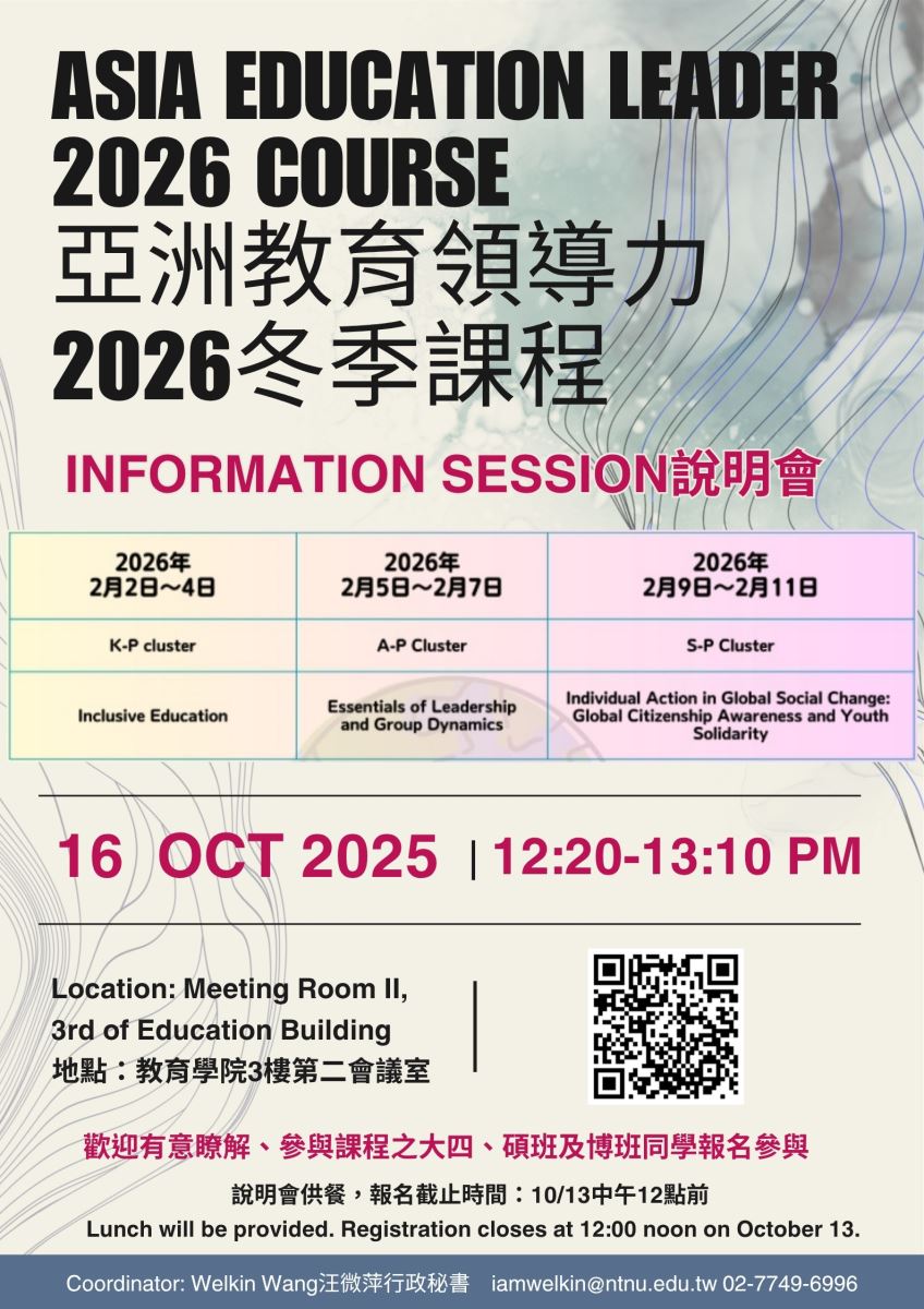 本校教育學院與政大、日本東北大學、韓國高麗大學以及南京師範大學於2014年起合力籌辦亞洲教育領導力(Asia Education Leadership, AEL)課程,於每年寒、暑假輪流在主辦學校地區辦理冬、夏季課程,本院承辦2026年冬季課程,課程分為K-P(知識)、A-P(情意)以及S-P(技能)三類,本次課程將於2026年2月2日至2月11日予日本東北大學舉辦,每間學校共開放10個參與名額,歡迎有意瞭解、參與課程之大四、碩班及博班同學報名參與說明會。