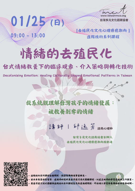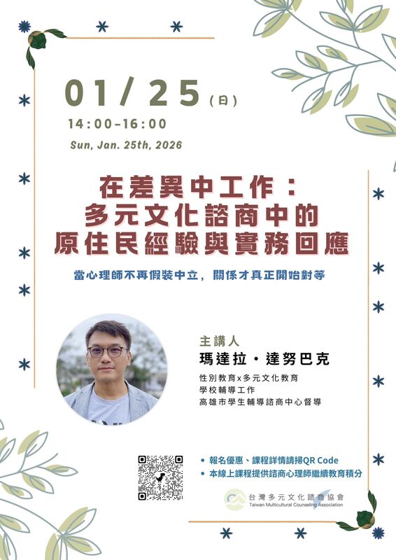 「當心理師不再假裝中立,關係才真正開始對等」。 本課程將引導學員辨識自身所處的位置,學習在諮商關係中回應差異、承接不對等,並將文化脈絡納入專業判斷,發展更貼近現場、可實際運用的多元文化敏感度及覺察能力。學習如何將這份覺察轉化為更對等的諮商關係,避免再生產殖民傷害,並實際成為促進復原與主體性的專業行動。