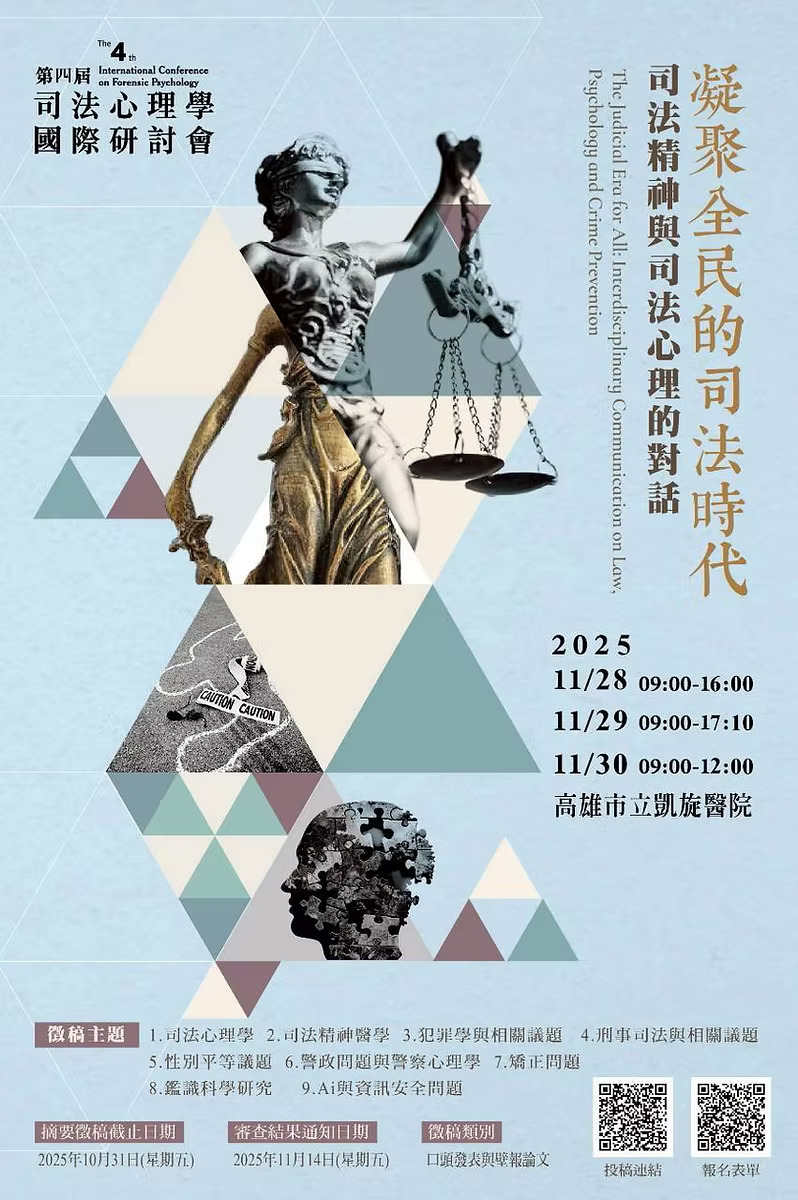 以下轉知高雄市立凱旋醫院主辦之「第四屆臺灣司法心理學『司法精神與司法心理的對話』國際研討會」活動訊息,歡迎踴躍投稿及報名參與。