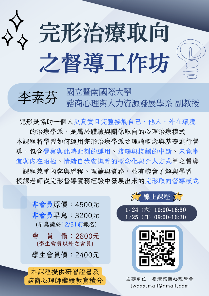 【課程名稱】「完形治療取向之督導」工作坊 【課程時間】1/24(六)10:00-16:30 、 1/25(日)9:00-16:30 【課程講師】李素芬副教授(國立暨南國際大學諮商心理與人力資源發展學系副教授) 【主辦單位】臺灣諮商心理學會 【授課地點】線上課程,擬使用Google Meet 【報名連結】https://reurl.cc/vKpgNL(付費課程) 【課程介紹】完形是協助一個人更真實且完整接觸自己、他人、外在環境的治療學派,是屬於體驗與關係取向的心理治療模式。本課程將學習如何運用完形治療學派之理論概念與基礎進行督導,包括覺察與此時此刻的運用、接觸與接觸的中斷、未竟事宜與內在兩極、情緒自我安撫等的概念化與介入方式等之督導,兼重內容與歷程,理論與實務,並有機會了解與學習授課老師從完形督導實務經驗中發展出來的完形取向督導模式。